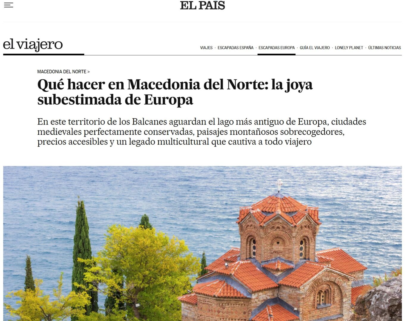 Шпанскиот весник „Ел Паис“објави текст во кој Македонија ја опишува како „автентична, изненадувачка и неистражена“. Извештајот се фокусира на историските локалитети, културните знаменитости и природните атракции на земјата, претставувајќи ја Македонија како место со различно наследство и живописни пејзажи.