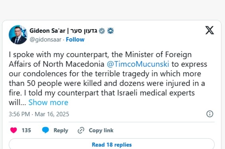 Израелскиот министер за надворешни работи Гидеон Саар го информираше министерот за надворешни работи на Северна Македонија, Тимчо Муцунски, дека израелски медицински експерти ќе допатуваат во земјава за да помогнат по пожарот во кој загинаа 59 луѓе.