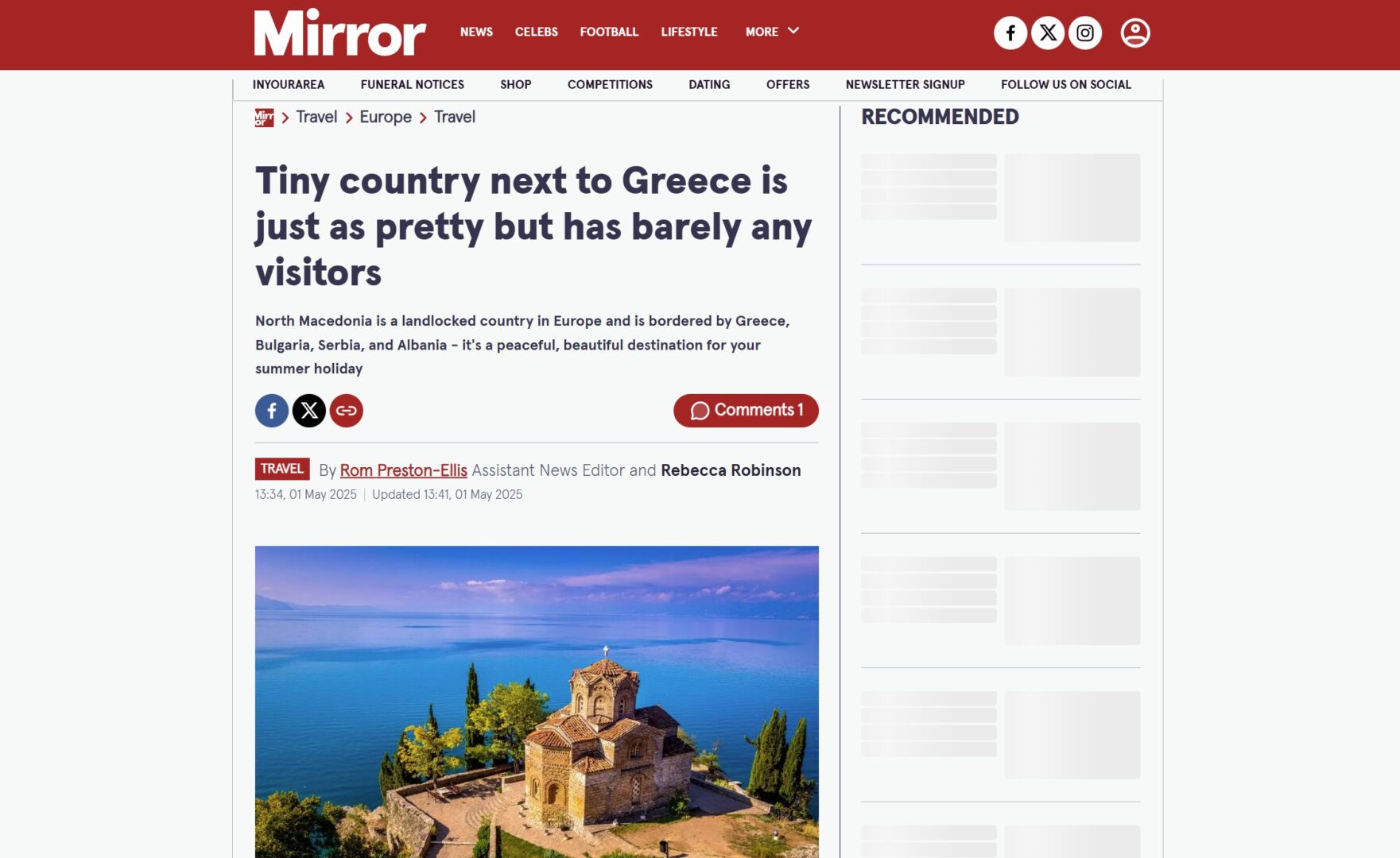 Во текст објавен од британскиот весник Mirror, Северна Македонија е претставена како „мирна, недоволно откриена и прекрасна“ европска дестинација за летен одмор. Во време кога туризмот е сѐ повеќе комерцијализиран, текстот ја позиционира земјата како алтернатива на масовниот туризам.
