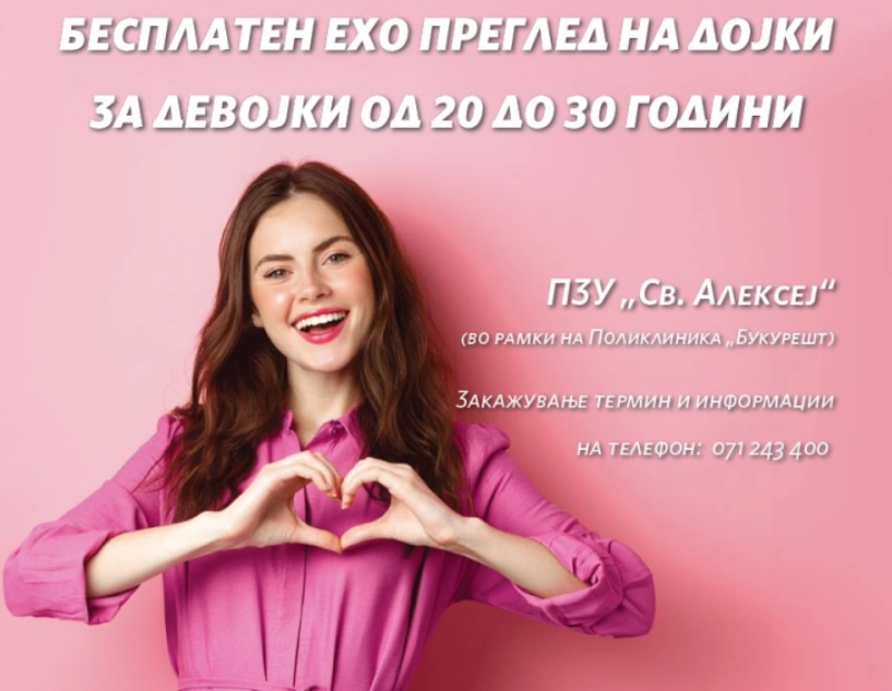 Во насока на подигнување на свеста кај младата популација за важноста на превентивните прегледи и грижата за здравјето на жените, Општина Карпош во соработка со ПЗУ „Свети Алексеј“ овозможува бесплатен медицински преглед на дојки, за девојки на возраст од 20 до 30 години кои се жителки на оваа скопска општина, информираат денеска од локалната самоуправа.