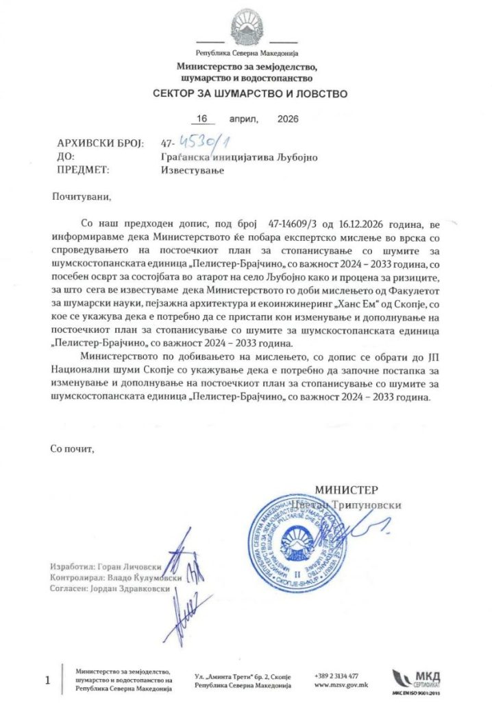 Од Министерството со допис ги известуваат жителите дека ваквиот чекор следува по добиено стручно мислење од Факултетот за шумарски науки, пејзажна архитектура и екоинженеринг „Ханс Ем“ од Скопје, во кое се укажува на потреба од измени на планот, со посебен осврт на состојбата и на ризиците во атарот на село Љубојно.