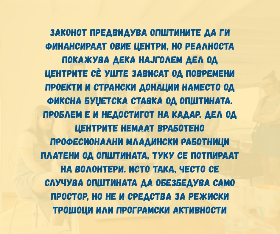 Законот предвидува општините да ги финансираат овие центри, но реалноста покажува дека најголем дел од центрите сè уште зависат од повремени проекти и странски донации наместо од фиксна буџетска ставка од општината. Проблем е и недостигот на кадар. Дел од центрите немаат вработено професионални младински работници платени од општината, туку се потпираат на волонтери. Исто така, често се случува општината да обезбедува само простор, но не и средства за режиски трошоци или програмски активности.