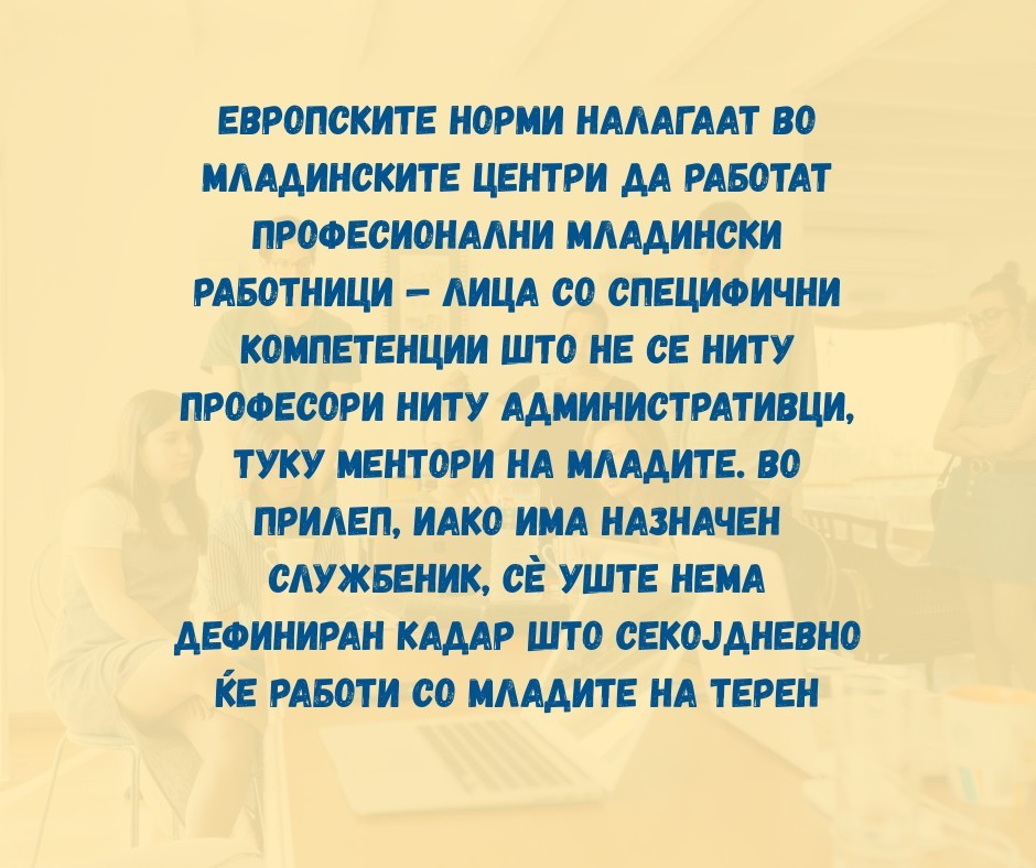 Младинскиот центар според овој документ е „безбедниот простор“ што општината е должна да го обезбеди за да може воопшто да се практикува квалитетна младинска работа. Овие стандарди предвидуваат дека еден функционален центар мора да се темели на неколку клучни столба, кои во Прилеп сè уште недостасуваат. Така, на пример, европските норми налагаат во центрите да работат професионални младински работници — лица со специфични компетенции што не се ниту професори ниту административци, туку ментори на младите. Во Прилеп, иако има назначен службеник, сè уште нема дефиниран кадар што секојдневно ќе работи со младите на терен.