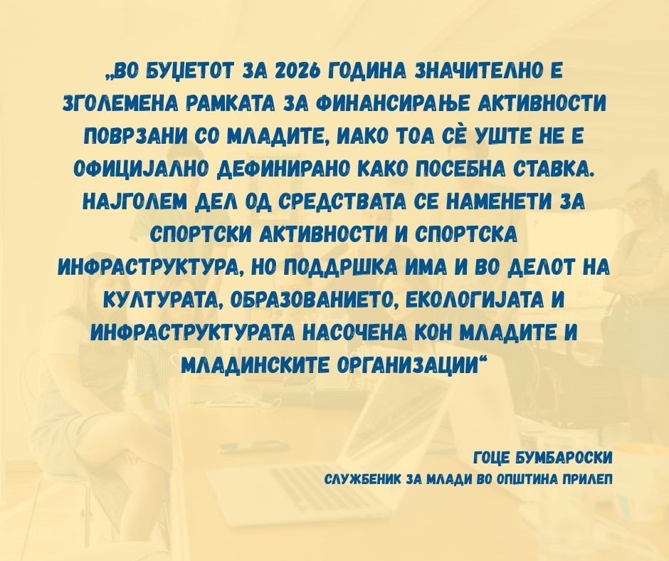 „Во Буџетот за 2026 година значително е зголемена рамката за финансирање активности поврзани со младите, иако тоа сè уште не е официјално дефинирано како посебна ставка. Најголем дел од средствата се наменети за спортски активности и спортска инфраструктура, но поддршка има и во делот на културата, образованието, екологијата и инфраструктурата насочена кон младите и младинските организации“, појаснува Бумбароски додавајќи дека иако нема посебна ставка, сите овие проекти се директна поддршка за младинскиот развој.