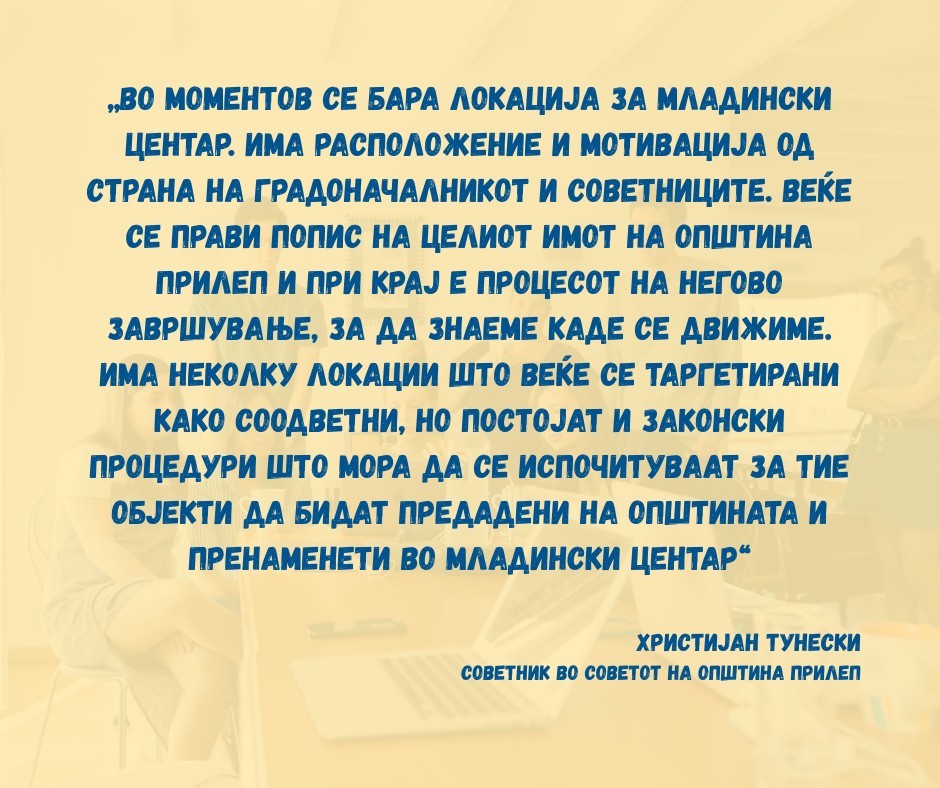 „Во моментов се бара локација за Младински центар. Има расположение и мотивација од страна на градоначалникот и советниците. Веќе се прави попис на целиот имот на Општина Прилеп и при крај е процесот на негово завршување за да знаеме каде се движиме. Има неколку локации што веќе се таргетирани како соодветни, но постојат и законски процедури што мора да се испочитуваат за да бидат предадени тие објекти на Општината и пренаменети во Младински центар“, вели Тунески.