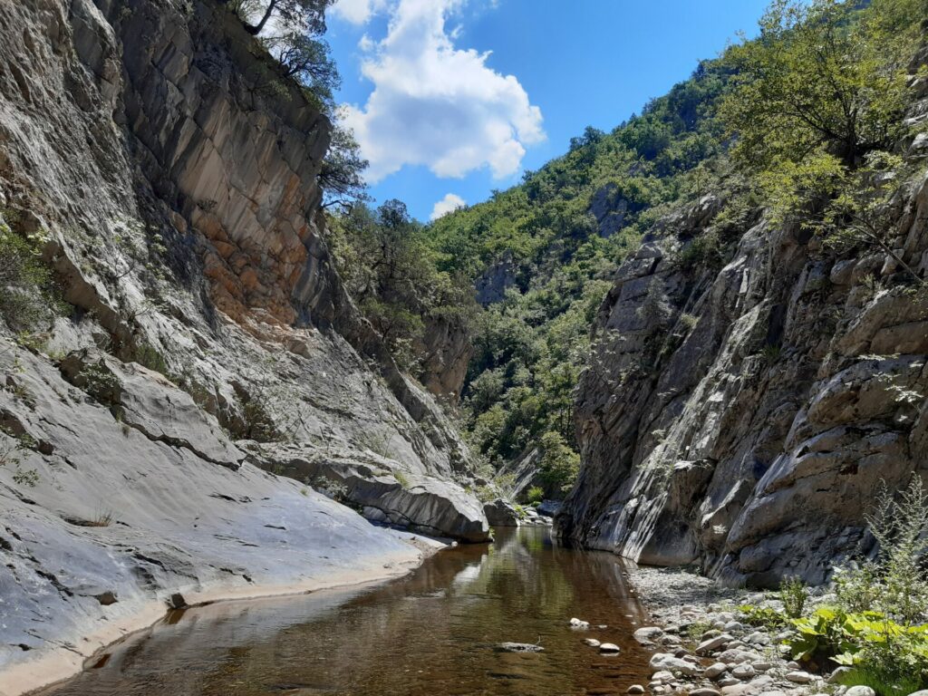 Наредниот ден еден црн штрк прелета ниско над нашите глави и ни претскажа дека ќе ни се отвори ксметот. Веднаш штом поминавме на другата страна од сртот, го чувме жуборот на втората река. Охрабрени од звукот, и од убавините што се раскриваа пред нашите очи, слеговме брзо до реката и најпосле се избањавме во бистри планински води. Повторно на вистински пат, тргнавме спротивно на течението, занемени од погледот на скалите што како сронети кули се извисуваа над зеленилото. По кратко време стигнавме до вливот на една притока, која ја цепеше карпата како со секира, формирајки неверојатно тесен мал кањон. Се испентаривме внатре восхитени дека во најтесните делови, растојанието меѓу каменестите стени беше едвај распонот на нашите раце. Стигнавме до мал но висок водопад кој капеше врз минијатурна џунгла од папрат и мов.
