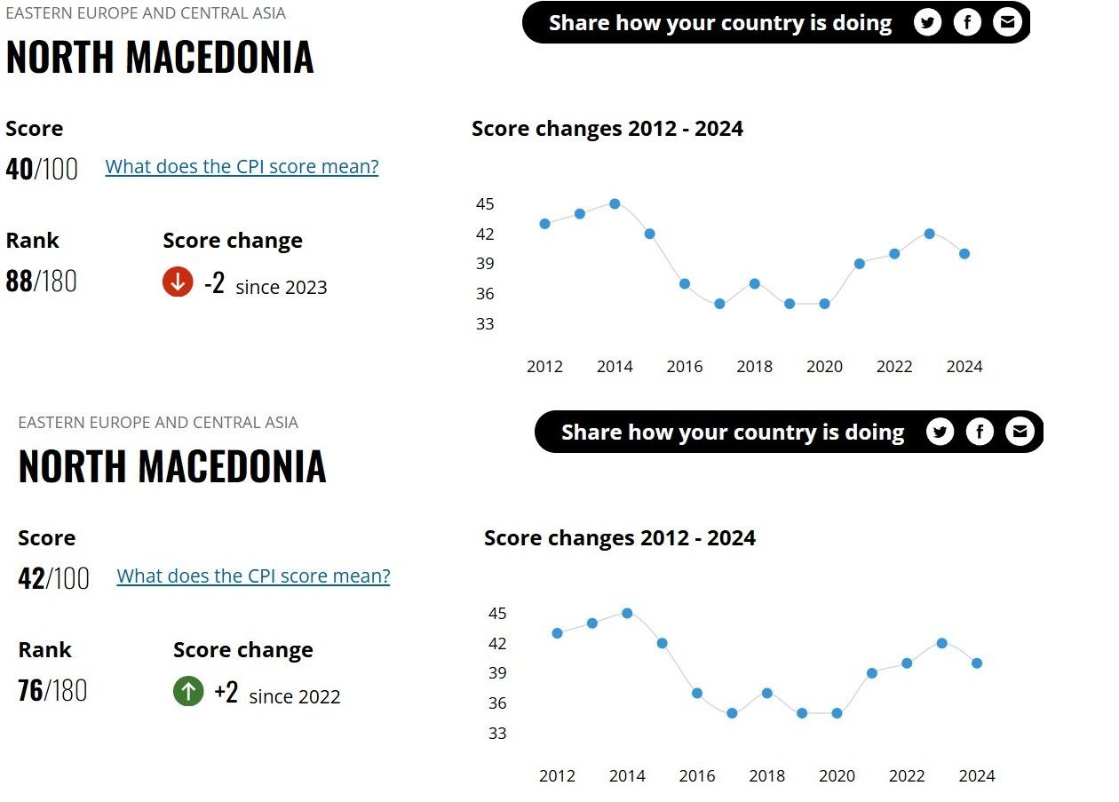 Кога ќе се споредат графиконите видливо е дека од 2019 година Македонија одеше само нагоре во справувањето со корупцијата, сѐ до 2024