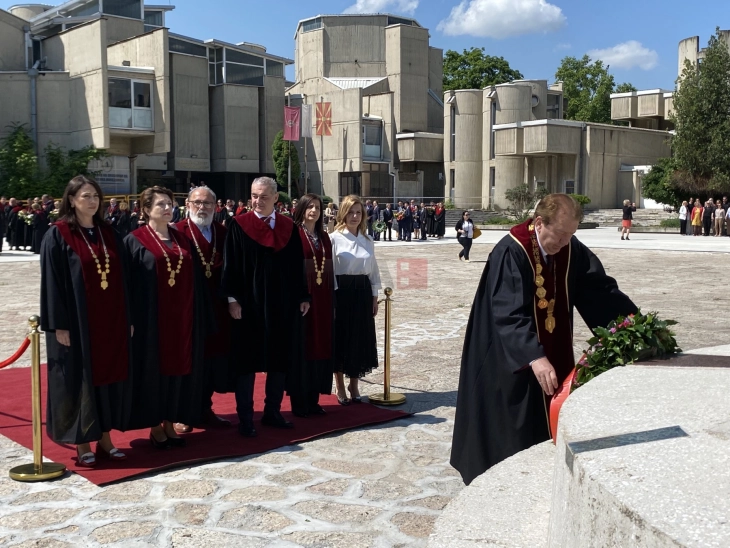 По повод одбележувањето на 74-годишнината од основањето на Универзитетот и одбележувањето на Денот на светите Кирил и Методиј, денеска беше положено цвеќе на споменикот во универзитетскиот кампус во Скопје.