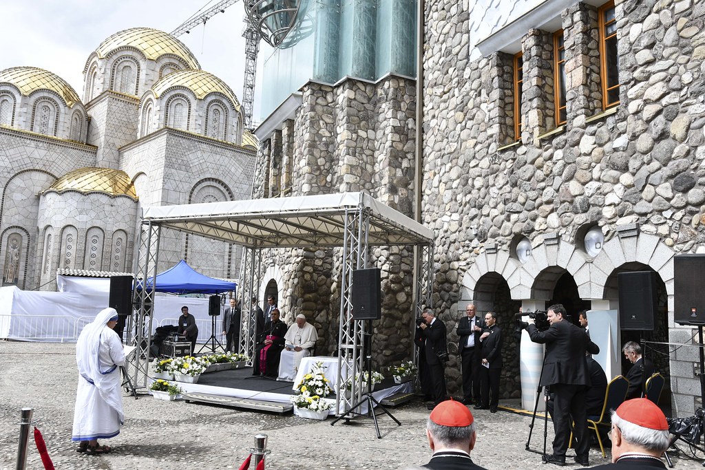 Подоцна, во просториите на спомен куќата на Мајка Тереза,  Светиот Отец 3) се сретна со верските лидери, а во амфитеатарот позади спомен куќата 4) оствари средба и со сиромашни лица.