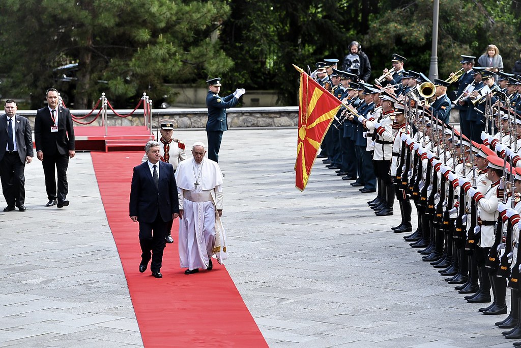После 1) официјалниот пречек на скопскиот аеродром, неговата Светост, Папата Франциск, во претседателската резиденција на Водно 2) се сретна со претседателот Ѓорге Иванов, со премиерот Зоран Заев, како и со претставници на граѓанското општество и дипломатскиот кор.