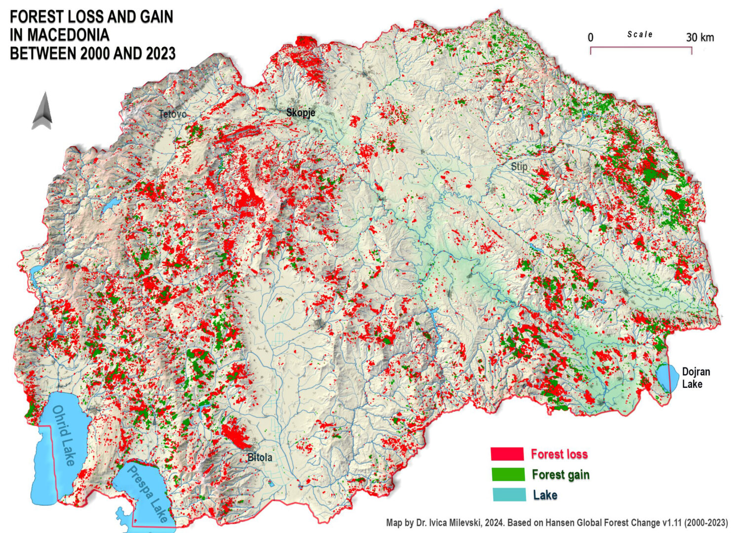 Со помош на Google Earth Engine, а врз основа на Hansen Global Forest Change v1.11 (2000-2023) базата на податоци, изработена е карта на загубата на шумски површини и на „нови“ шумски површини во Македонија, за периодот 2000-2023 година, објави денеска граѓанската иницијатива Охрид СОС, повикувајќи се на визуелизацијата на ИГЕО.