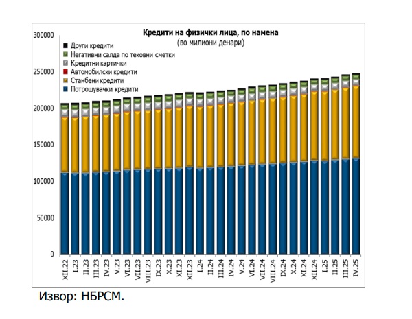 Во април, автомобилските кредити забележаа раст на месечна и на годишна основа за 0,4% и 2,3%, додека кредитите одобрени на кредитни картички остварија месечен раст од 0,3%, при годишен пад од 7,9%. Негативните салда на тековните сметки, во април, забележаа месечно намалување од 9,3%, во услови на годишен раст од 0,1%. Во април, кредитите одобрени врз други основи бележат месечен и годишен пад од 2,3% односно 9,0%.