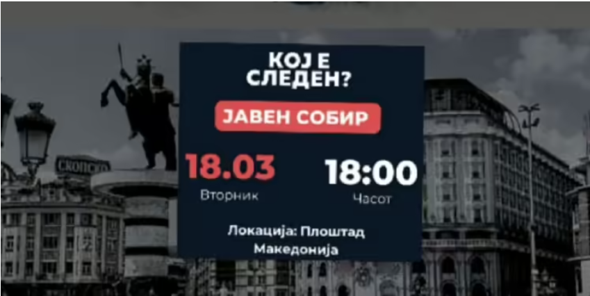 ФАКТ: Организатор на јавниот собир на 18 март, на плоштадот „Македонија“ во Скопје, со почеток во 18 часот е граѓанската иницијатива „Кој е следен?“.