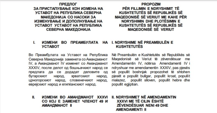 Во таа насока, Владата на Република Северна Македонија го усвои Предлогот за пристапување кон измена на Уставот на Република Северна Македонија со насоки за изменување и дополнување на Уставот на Република Северна Македонија и му го поднесува на Собранието на Република Северна Македонија. Во Предлогот се содржани измени и дополнувања на Уставот на Република Северна Македонија што се однесуваат на вклучување на деловите од бугарскиот народ, хрватскиот народ, црногорскиот народ, словенечкиот народ, еврејскиот народ и египќанскиот народ во Преамбулата на Уставот, Амандманот XXXVI со кој се заменува членот 49 и Амандманот II, како и Амандманот XII со кој е заменет членот 78.