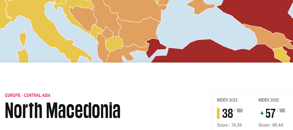 Северна Македонија е рангирана на 38. место од вкупно 180 земји во светот според Глобалниот индекс за слободата на медиумите на „Репортери без граници“. Земјава бележи скок од 19 места во однос на 2022 година и е најдобро позиционирана во регионот на Западен Балкан, пред Црна Гора (39), Хрватска (42), Косово (56), Босна и Херцеговина (64) и Србија (91) и Албанија (96).
