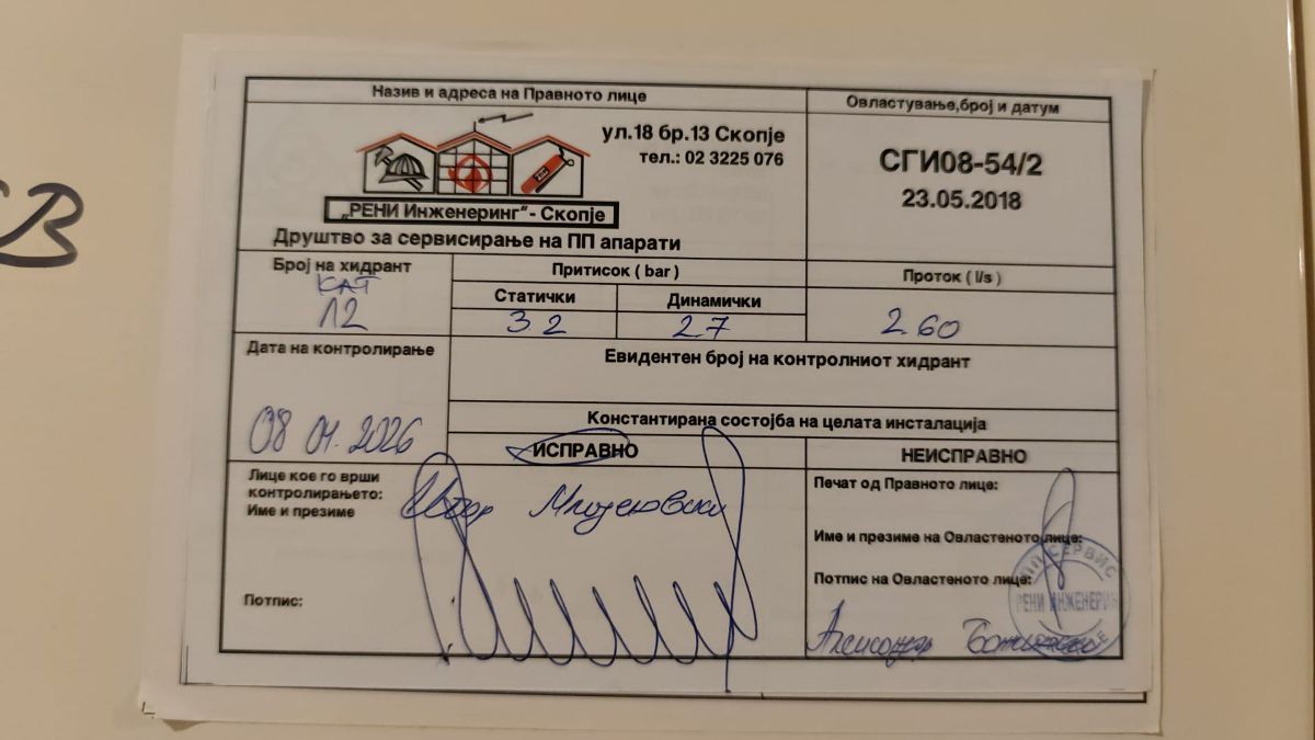 Истовремено, уште истиот ден, на сите противпожарни апарати во кула Д (објект од 40 ката со 400 станови) беа поставени нови контролни лепенки со кои се потврдува дека опремата е „исправна“, со датум на извршена контрола 08.04.2026 година, датум кој во моментот на поставување на лепенките сè уште не беше и не е настапен.