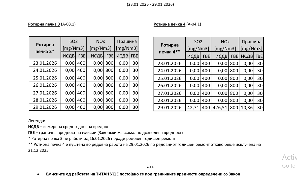 • Бројките недвосмислено покажуваат дека и кога ТИТАН Усје не работи, амбиенталниот воздух е со истиот квалитет, што е јасна потврда за тоа дека компанијата не е причина за состојбите со квалитетот на воздухот во Скопје. Загадувањето во Скопје беше високо и во изминатиот период кога ТИТАН Усје воопшто не работеше. Имено, поради редовен ремонт двете печки не работеа – едната, печка број 4, од 20.12.2025 година, а втората, печка број 3 од 16.01.2026 година, се до 29.01.2026 година, кога печката број 4, беше повторно вклучена, согласно работниот план. И покрај тоа што ТИТАН Усје целосно не работеше во овој период, највисоката вредност на ПМ 10 честичките достигна и до 275 микрограми на кубен метар. (Во прилог табели)
