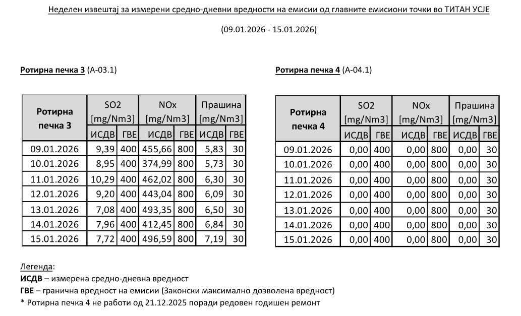 - Ова се истакнува во соопштението од фабриката до медиумите придружено со редовниот неделен преглед на средно-дневните мерења на емисиите од главните емисиони точки на цементарницата од последниве седум дена (09.01.2026 – 15.01.2026).
