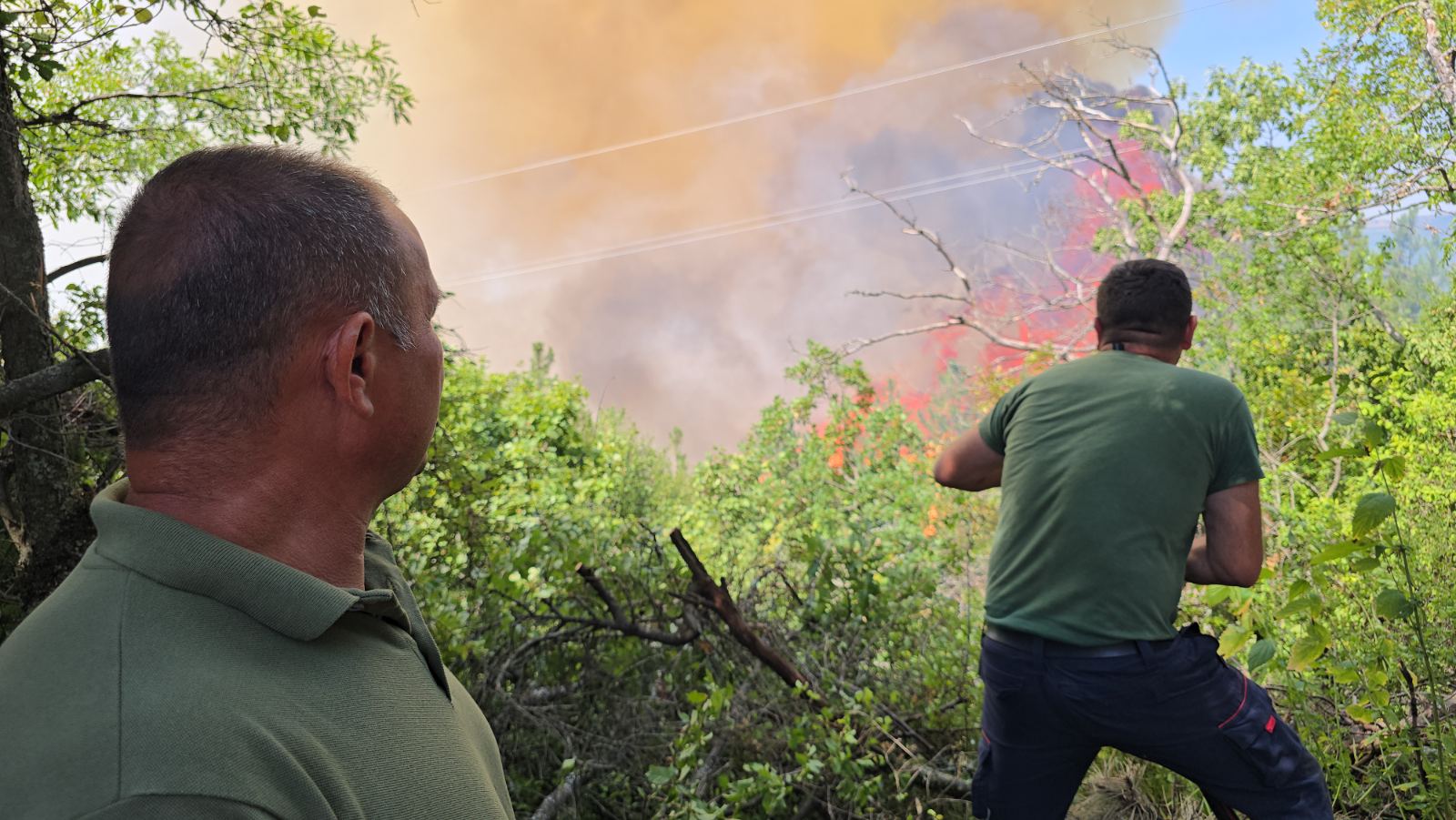 Како што самиот Ангелов кажа, бидејќи теренот е непристапен, тие можат да го гаснат само до оваа линија. Инаку, гори густа зимзелена шума, а пожарот како што се гледа од видеото е огромен.