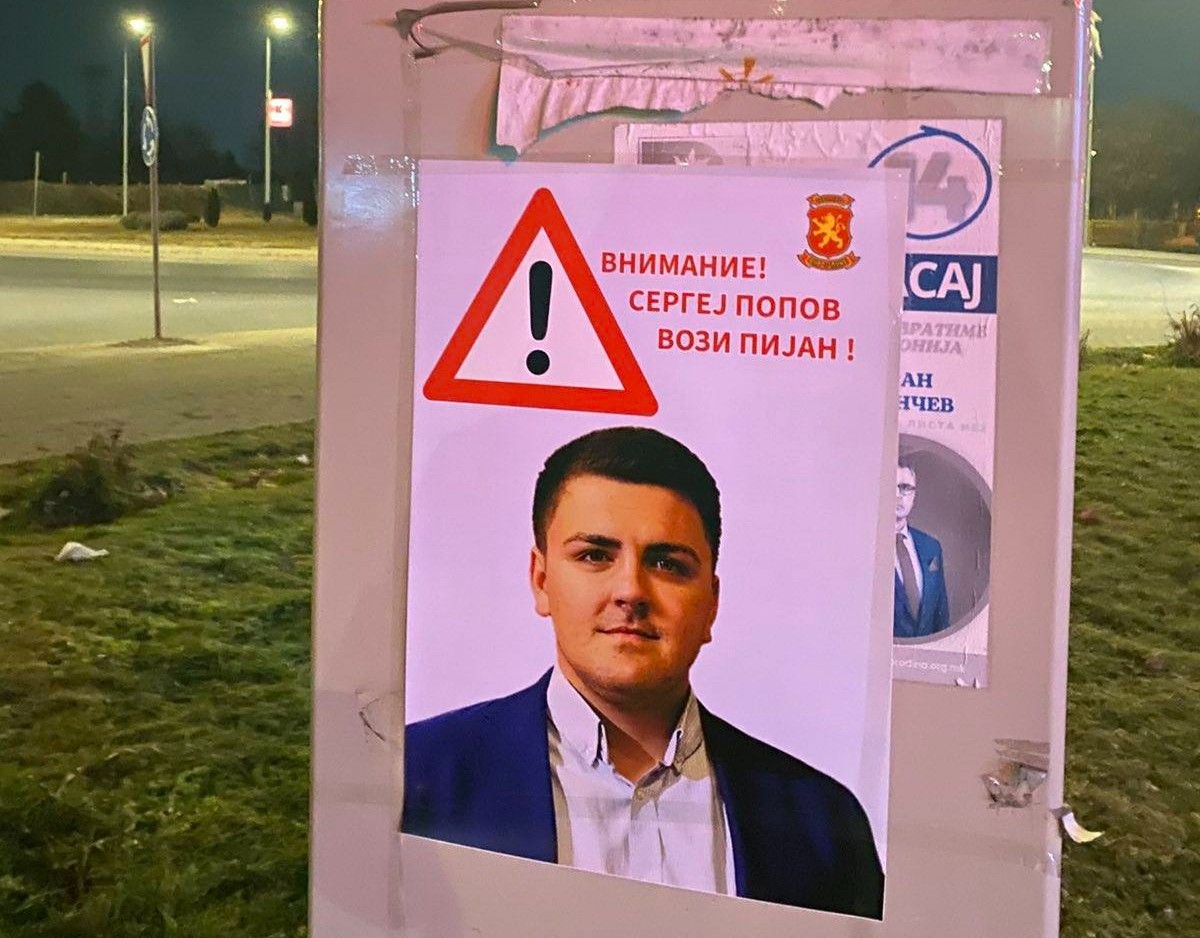 На повеќе локации во Скопје осамнаа плакати и постери на кои пишува „Вимание, Сергеј Попов вози пијан“.