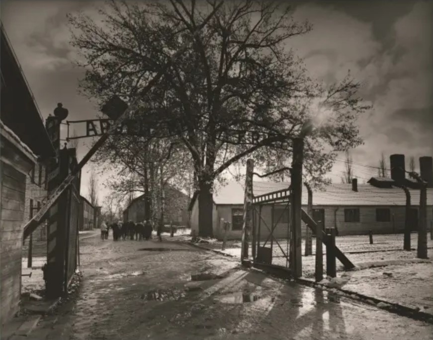 Влезната порта во концентрациониот логор Аушвиц-I, познат и како Стамлагер, е на врвот со натписот „Arbeit macht frei“ („Работата ве ослободува“).