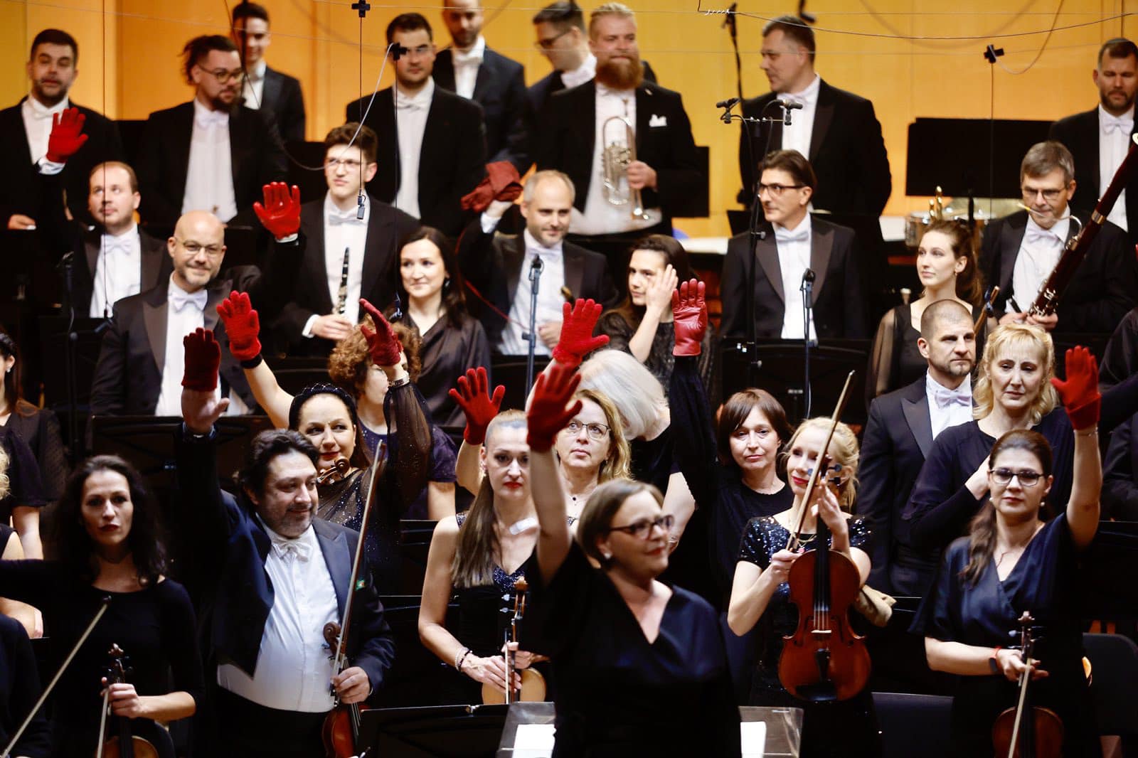 Синоќешниот концерт во Белградската филхармонија заврши со обраќање на музичарите на публиката и кревање раце држејќи ги црвените ракавици како симбол на студентските протести и паролата – „Рацете ви се крвави“.
