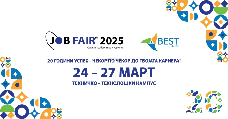 Бордот на Европски Студенти по Технологија – Скопје (БЕСТ) го најавува 20. Саем за вработување и кариера – Job Fair. Настанот ќе се одржи од 24-27 март на техничкиот кампус (ФИНКИ, ФЕИТ, МФС, ТМФ) и ќе привлече повеќе од 5 000 студенти и над 90 компании.