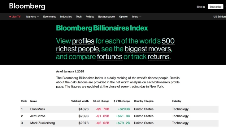 Илон Маск, основачот на Тесла и СпејсЕкс, води со голема предност или 432 милијарди долари. За една година, неговото богатство се зголемило за 203 милијарди долари. На второ место е Џеф Безос од Амазон (239 милијарди долари), а на трето е Марк Цукерберг (компанијата Meта, 207 милијарди долари). Овие тројца, како и основачите на другите технолошки гиганти – Џенсен Хуанг (Nvidia), Сергеј Брин и Лари Пејџ (Гугл), Лари Елисон (Oracle) и Мајкл Дел (Dell) – го предводат списокот на милијардери чии богатство пораснало најмногу за една година. Овие компании чинат 4 отсто од вкупното зголемување на богатствата на милијардерите и обезбедија повеќе од половина од растот на индексот на берзата S&P 500, кој за една година порасна за 24 отсто, забележува Блумберг.
