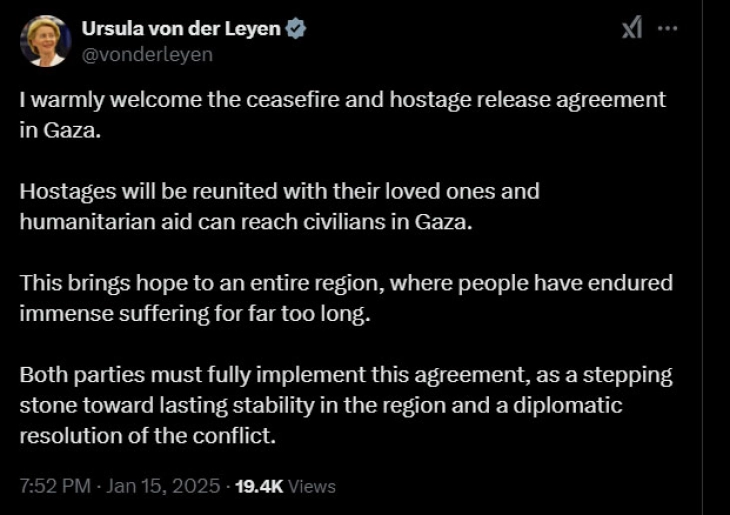 Шефицата на Европската комисија Урсула фон дер Лајен ја поздрави најавата за прекин на огнот и договор за ослободување заложници меѓу Хамас и Израел, повикувајќи ги „целосно да го спроведат“ договорот.