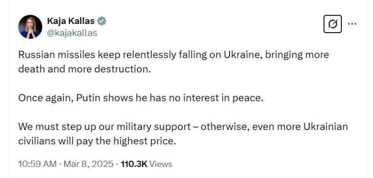 Шефицата за надворешна политика на Европската унија Каја Калас изјави дека руските напади врз Украина во текот на ноќта покажуваат дека Кремљ „нема интерес за мир“.