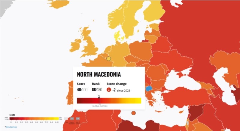 Индексот на перцепција на корупцијата на Транспаренси Интернешнл за 2024 година покажува пад од два индексни поени на земјава во однос на минатата, рангирајќи ја на 88 позиција од вкупно 180 држави.