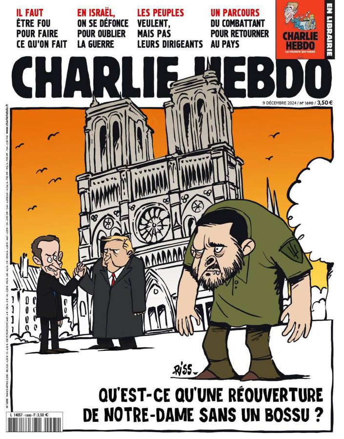 На социјалните мрежи кружи лажна верзија на насловната страница на францускиот сатиричен неделник Шарли Ебдо, која го прикажува украинскиот претседател Володимир Зеленски како Квазимодо, еден од главните ликови во романот „Богородичната црква во Париз„ (Грбавецот од Нотр Дам), на францускиот писател Виктор Иго.