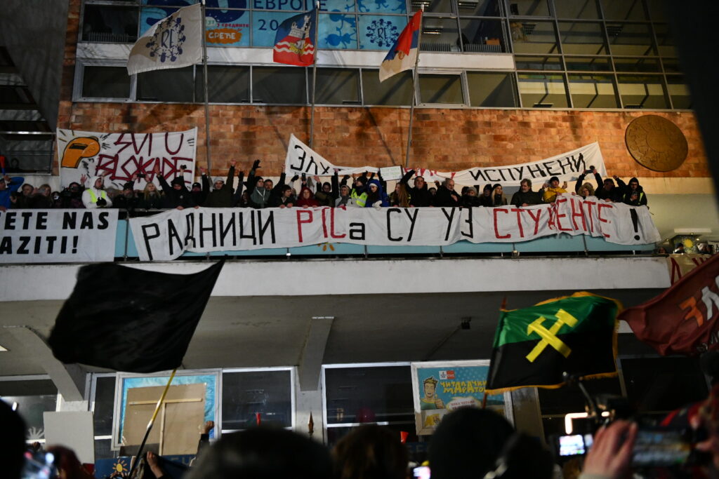 Од зградата на РТС беше развиен транспарент „Работниците на РТС се со студентите“, а толпата возврати со скандирање „Ви благодариме за поддршката“.