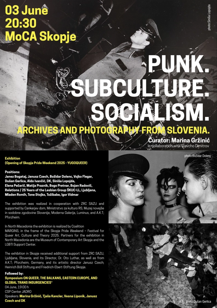 Фестивалот „Викенд на гордоста – Скопје 2025“ денеска свечено ќе биде отворен во Музејот на современа уметност со изложбата „ПАНК. СУПКУЛТУРА. СОЦИЈАЛИЗАМ. АРХИВИ И ФОТОГРАФИЈА ОД СЛОВЕНИЈА“, голема архивска поставка што низ фотографија и документи го истражува словенечкото панк-движење од крајот на 1970-тите до средината на 1980-тите години.