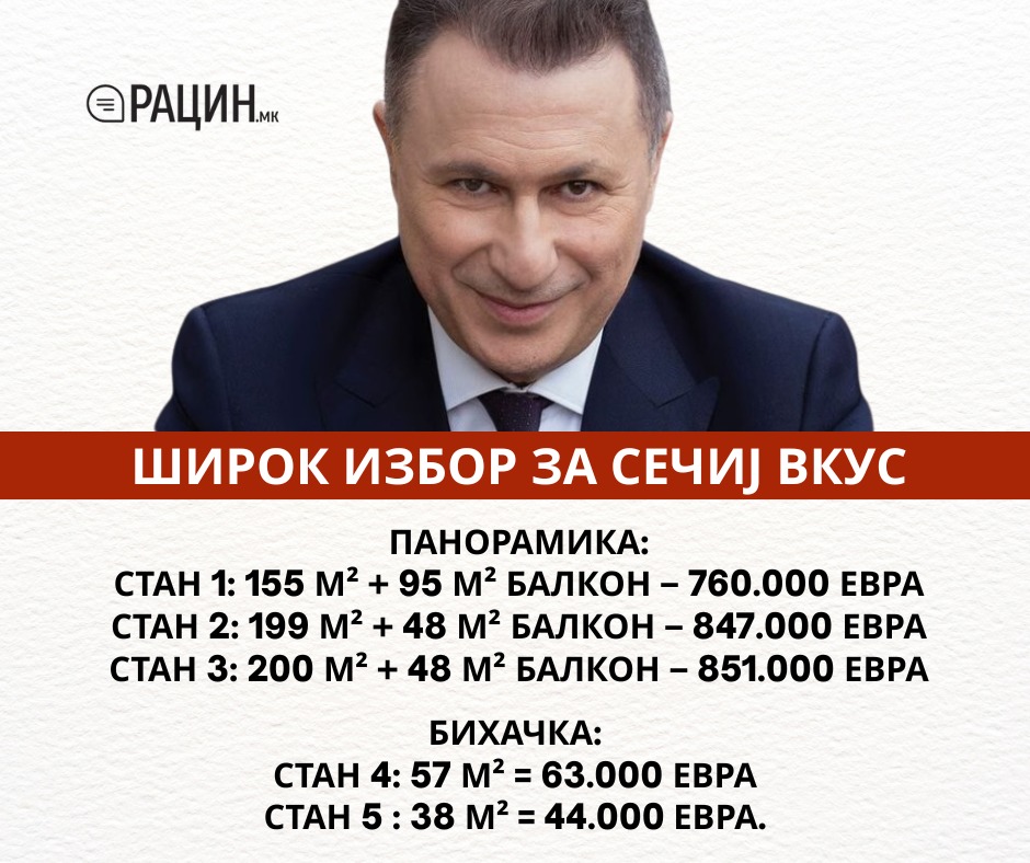 Агенцијата за управување со одземен имот отвори наддавање за луксузното портфолио на поранешниот премиер Никола Груевски: три станови на Водно по 200 m² со панорамски тераси се ценети по 850 000 евра, а четвртиот – 150 m² со џакузи на 95-метарска тераса – стартува од 760 000 евра. Двата помали стана на „Бихаќка“, кои служеле како библиотека и работен кабинет, се нудат за 63 000, односно 44 000 евра.
