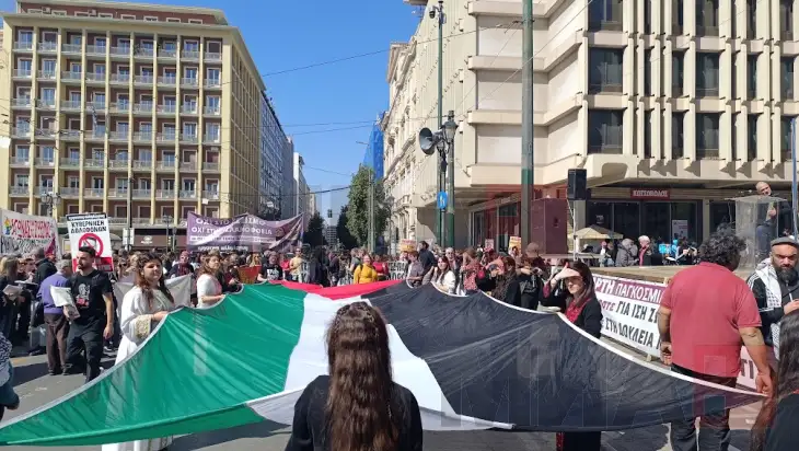 На денешниот протест во центарот на Атина, посебен акцент беше ставен на палестинските жени, а беше поставено и големо палестинско знаме кое го држеа девојки во традиционални носии.