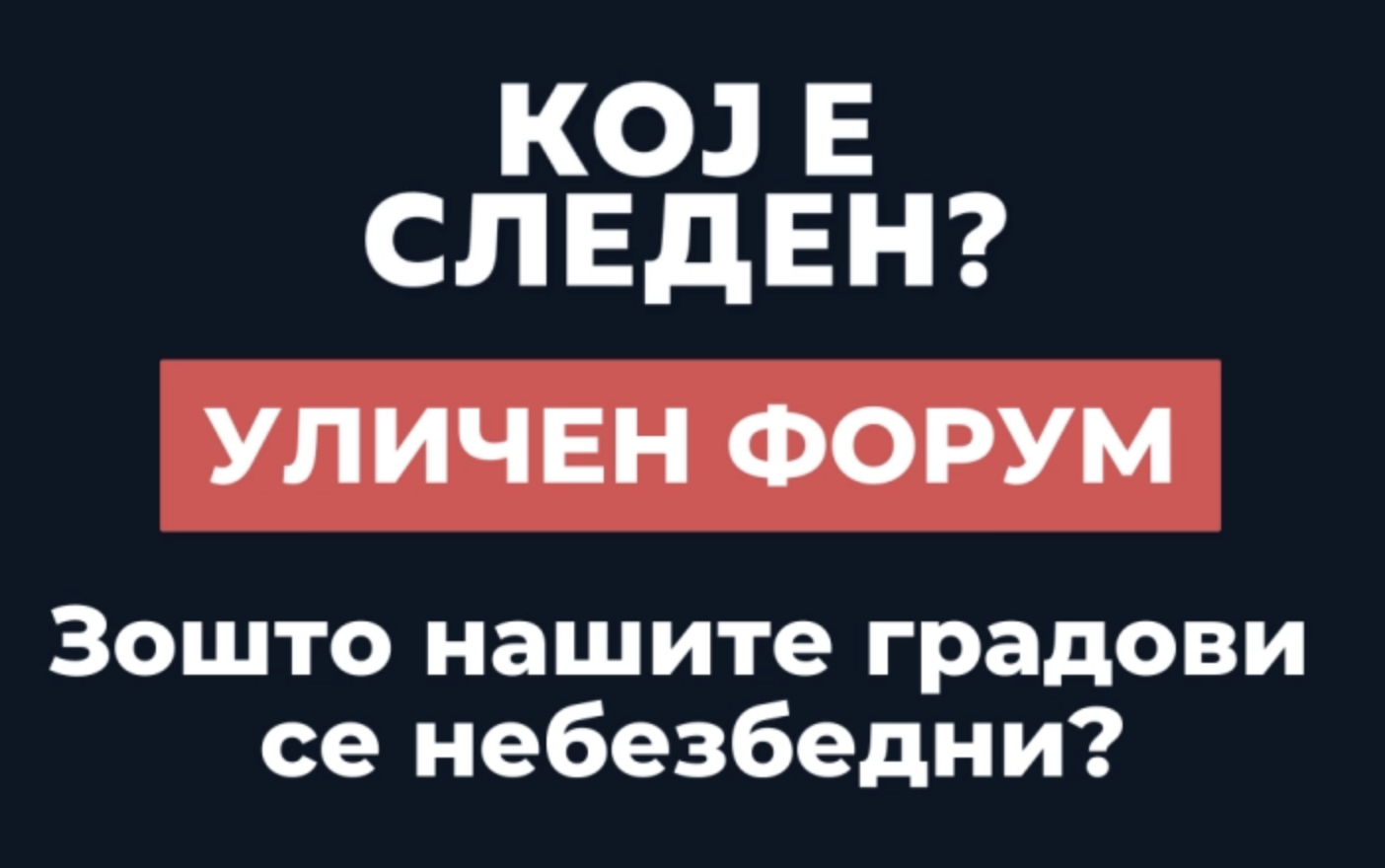 Во Скопје денеска ќе се реализира првиот уличен форум „Зошто нашите градови се небезбедни?“. Како што информира организаторот „Кој е следен?“, ќе се собираат сите идеи и предлози за посигурни улици – од железнички градски превоз во Скопје, до урбанистички промени за подобрување на сообраќајната култура.