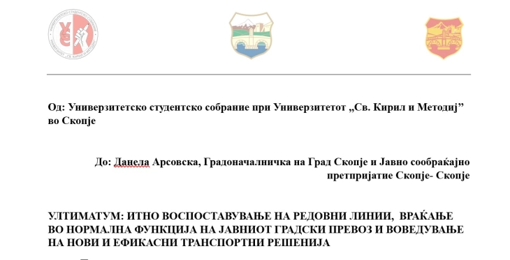 Јавното Сообраќајно Претпријатие Скопје- Скопје и градоначалник на град Скопје г-ѓа Данела Арсовска до крајот на утрешниот ден 21.11.2024 да воспостават итна и неодложна редовност на автобуските линии и враќање во нормална функција на јавниот градски превоз во град Скопје со цел зачувување на интегритетот на студентите и студенскиот стандард.
