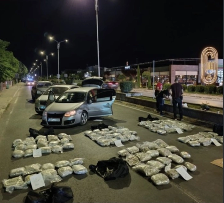 -При преглед на патничко возило „голф“ со фалсификувани регистарски ознаки, управувано од Е.Б., биле пронајдени шест торби со 100 пакувања марихуана, со вкупна тежина од околу 100 килограми, стои во полициското соопштение.