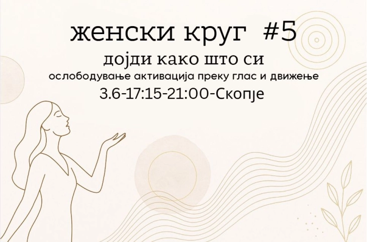 Во Скопје денеска ќе се одржи петтото издание на трансформативниот и поддржувачки настан „Женски Круг #5: Дојди како што си!“, настан наменет за жени од сите возрасти и животни патеки, кои се подготвени да го ослободат својот глас, телото и енергијата во безбеден и сочувствителен простор.