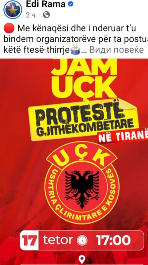 Тој објави и фотографија со натпис „Јас сум УЧК – сензационален протест во Тирана“.