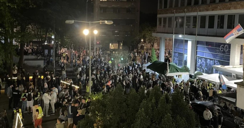Стотици граѓани и студенти разговараат за состојбата во државата и разни научни теми. Бројот на граѓани пред седиштето на РТС не е фиксиран, луѓето постојано се менуваат, доаѓаат и си одат во помали групи, но платото пред јавниот сервис е секогаш полно.