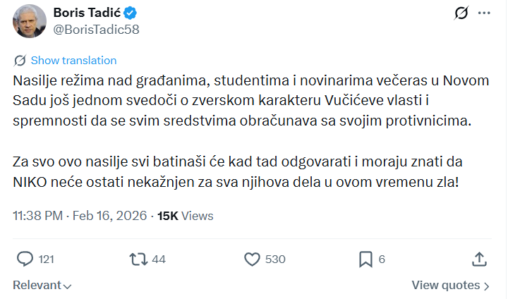 Лидерот на Социјалдемократската партија и поранешен претседател на Србија, Борис Тадиќ, изјави дека насилството за време на протестот во Нови Сад го открива „бруталнoто лице“ на власта.