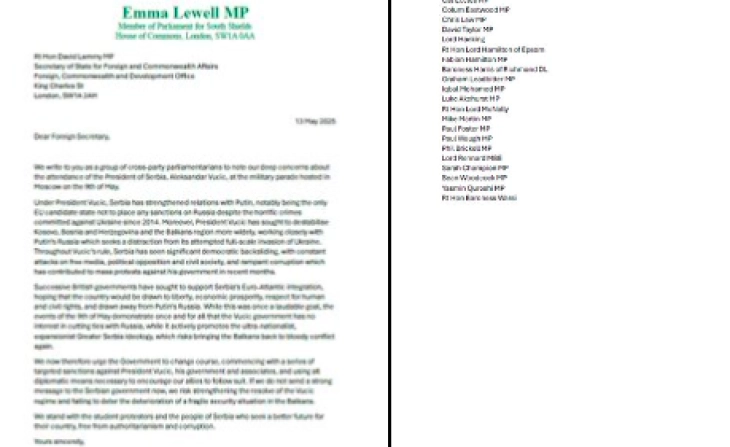 „Му напишав писмо на министерот за надворешни работи, барајќи значителна промена во пристапот на нашата надворешна политика кон Србија, по присуството на претседателот Вучиќ на воената парада во Москва на 9 мај. Писмото го потпишаа уште 25 парламентарци“, објави на Х пратеничката на британскиот парламент Ема Левел.