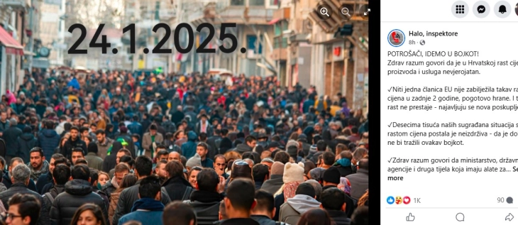 Повикот за бојкот се споделуваше на социјалните мрежи изминатите денови: „На 24 јануари во Хрватска се организира бојкот против високите цени на храната. Се повикуваат граѓаните на тој ден да не купуваат ништо, апсолутно ништо. Подгответе се за тој ден како да е недела“, стои во пораките.