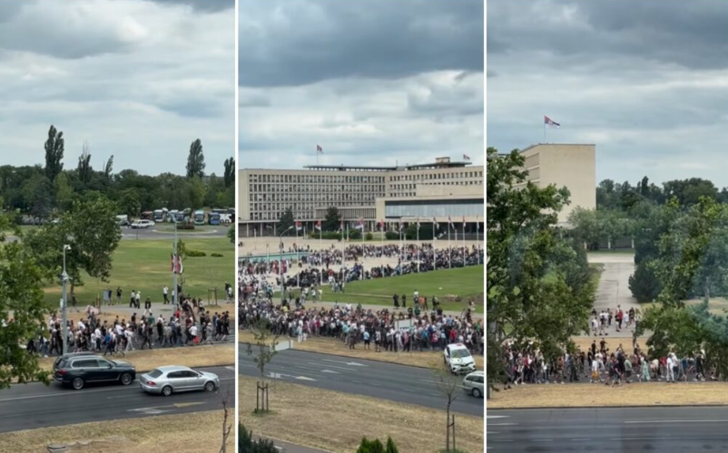 Уште од раните утрински часови, организирано беа довезувани симпатизери на СНС во Белград, главно со автобуси. Моментално, голем број автобуси се паркирани околу Палатата на Србија. Според регистарските таблички и превозниците, дел од пристигнатите групи се од Лазаревац, Нови Сад, Чачак, Прибој и други градови низ Србија.