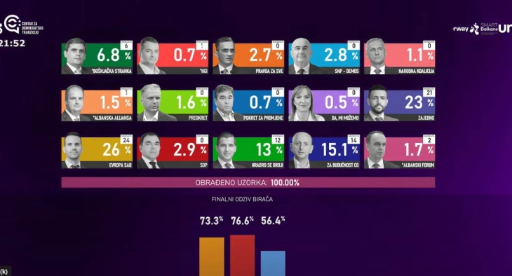 Центарот за демократска транзиција (ЦДТ) по преброените 100 отсто од гласовите на денешните вонредни парламентарни избори во Црна Гора, посочи дека најдобар резултат освои Движењето Европа сега (ПЕС) предводено од Милојко Спајиќ – 26 отсто од гласовите.