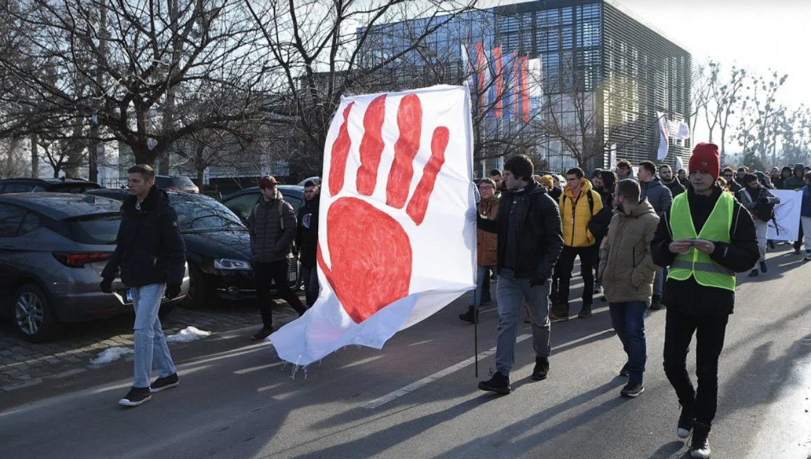 Симболот на студентскиот „Отпор“ беше стегната тупаница. Денес, дланката е црвена како крвава трага од 15 исчезнати животи под настрешницата на Железничката станица во Нови Сад. Отпечатокот на крвава тупаница беше пронајден меѓу графитите на ѕидовите, тротоарите, фолиите и кренати крвави раце на театарските сцени, пишува денеска српски „Данас“.