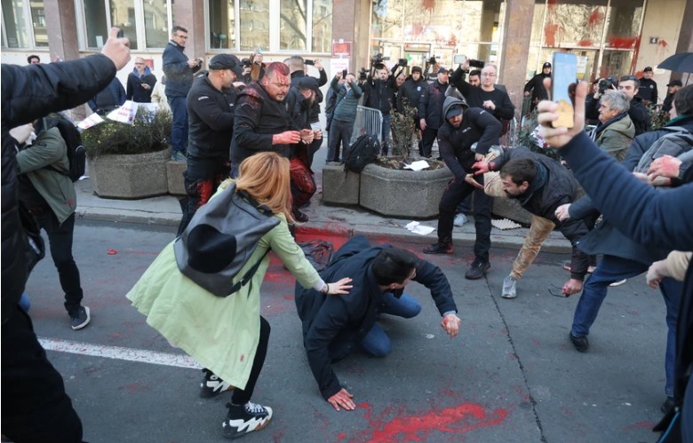 Пред зградата на Градското собрание на Белград денеска избувна масовна тепачка меѓу граѓани и припадници на обезбедувањето, откако демонстрантите се обиделе да ја отстранат заштитната ограда. Обезбедувањето реагирало со физичка сила, а ситуацијата брзо ескалирала во жесток судир, јавуваат српски медиуми.