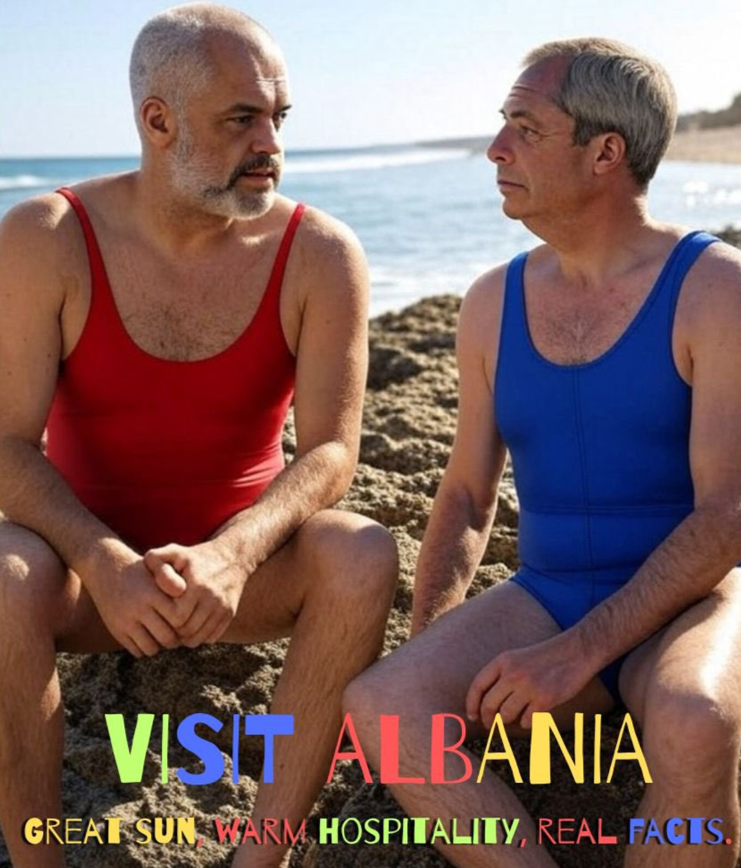 Во саркастичен тон, премиерот му предложи на Фараж јавен облог: „Ако вашата бројка ‘еден од 50’ се покаже точна, ќе се обврзам да ги вратам сите. Ако не, ве поканувам во Албанија како мој почесен гостин — на вистинско сонце, вистинско гостопримство и вистински факти.“ Понудата беше придружена со генерирана фотографија од вештачка интелигенција, на која Рама и Фараж се прикажани во костими за капење на албански плажи — визуелна иронија што привлече големо внимание на социјалните мрежи.